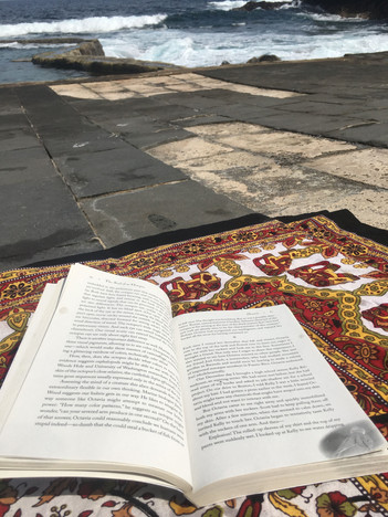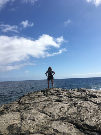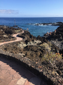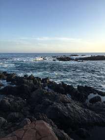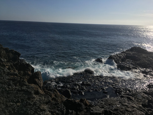 I had more garlic shrimp for lunch and then we ventured out to the lava flows near town, where the stone seems to flow like molten lava. It looks like it erupted last week, not thousands of years ago. The coastline here is one of my favorites, because it has brilliant turquoise water, crashing waves, sea arches, rainbow crabs scurrying about, and nothing but water as far as the eye can see. There's no more islands on this horizon –– nothing but sky and sea for thousands of miles, truly the edge of the world.