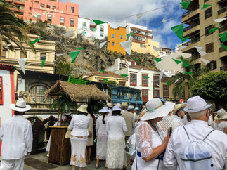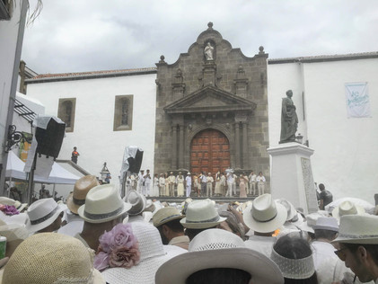 We needed to catch a bus from El Paso to Santa Cruz de La Palma, the center of the festival. This usually would be no problem, but all the buses were running late and jammed full because everyone on Earth (as we say in Spanish, todo el mundo) was trying to get to Santa Cruz at the same time, all dressed beautifully in white. Our bus arrived 15 minutes after it was scheduled and was packed wall to wall, with people shoved up against the window--the driver drove by with a grim shake of his head. Fortunately, we had the ultimate ally--angry older local women who (after yelling at the first bus driver about injustice) called the bus station and had them send a bus just for us! So it all worked out and we made it to Santa Cruz just as the party was starting.