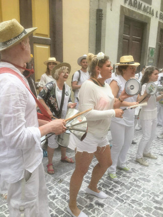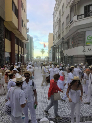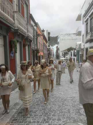 Los Indianos is a festival to commemorate the Spaniards who emigrated to the Americas during the colonization in the 1500s. Many people left Spain (and La Palma in particular) to make their fortune in places like Cuba or Venezuela and came back years or generations later. Everyone at the festival wears fancy white clothes, complete with lots of lace, wide-brimmed hats, long dresses, shawls, and jewelry. Many people even have fake money falling out of their pockets, since the returning immigrants had made their fortune in the New World. Most interestingly, we all throw white power--baby powder--at each other all day and night. There are outside bars set up all throughout the city, with DJs and bands playing music, and it is just a great big outdoor party with 50,000 friends (about triple the city's normal population).