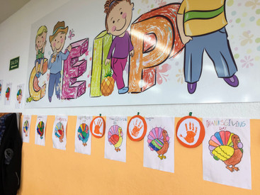 The kids at school also spent the month decorating turkeys (after having the shock of their lives after seeing just how big a real turkey is thanks to Turkey Pardoning videos on YouTube) and talking about what there is to be thankful for. The littlest ones made these adorable pumpkin cards with orange paint handprints! All the art made for great decorations to make it really feel like fall in the cafeteria, even with the sun shining off the palm trees just outside.